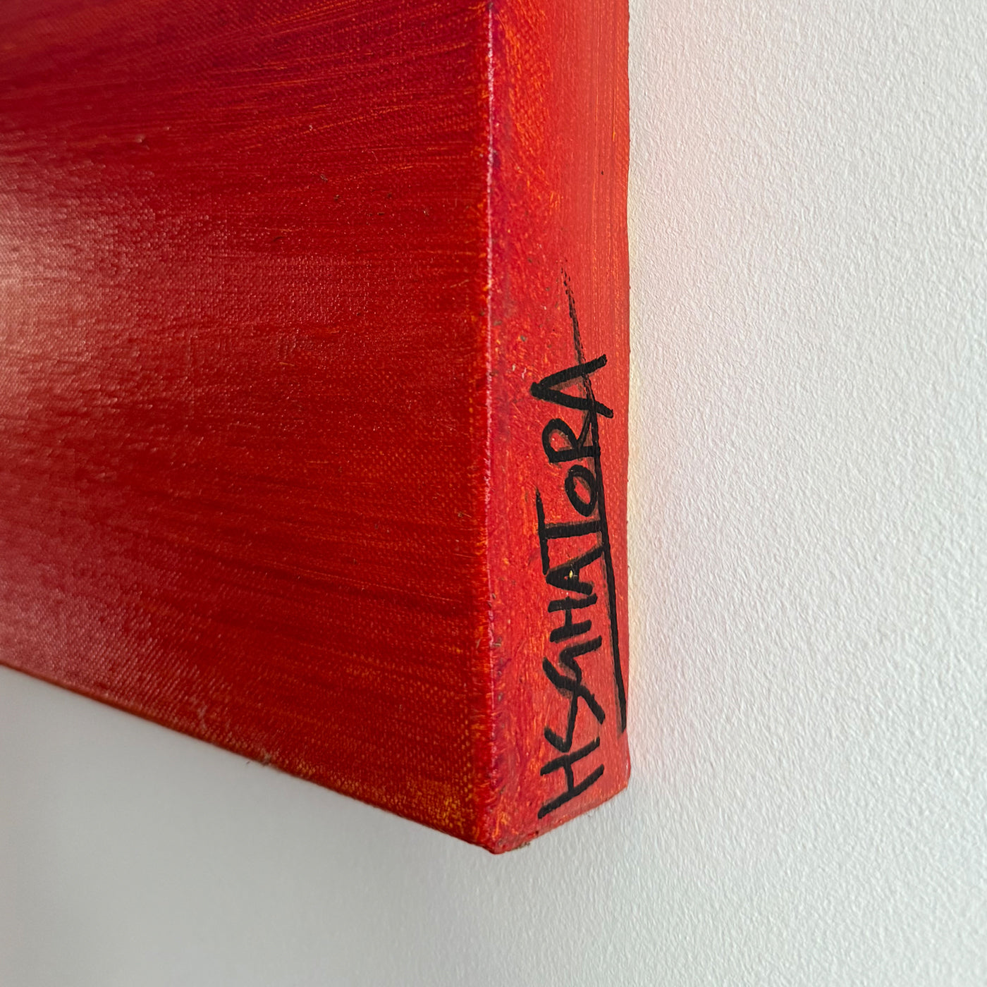 This painting is all about warmth and light. Layers of deep red and orange stretch across the canvas, broken by a thin, dark line near the top that gives the piece its balance. The artist used wide strokes and blended tones to create a glowing surface that almost feels alive. There’s a calm rhythm to it — strong, simple, and full of heat. It’s a striking piece that brings warmth and quiet energy to any space.