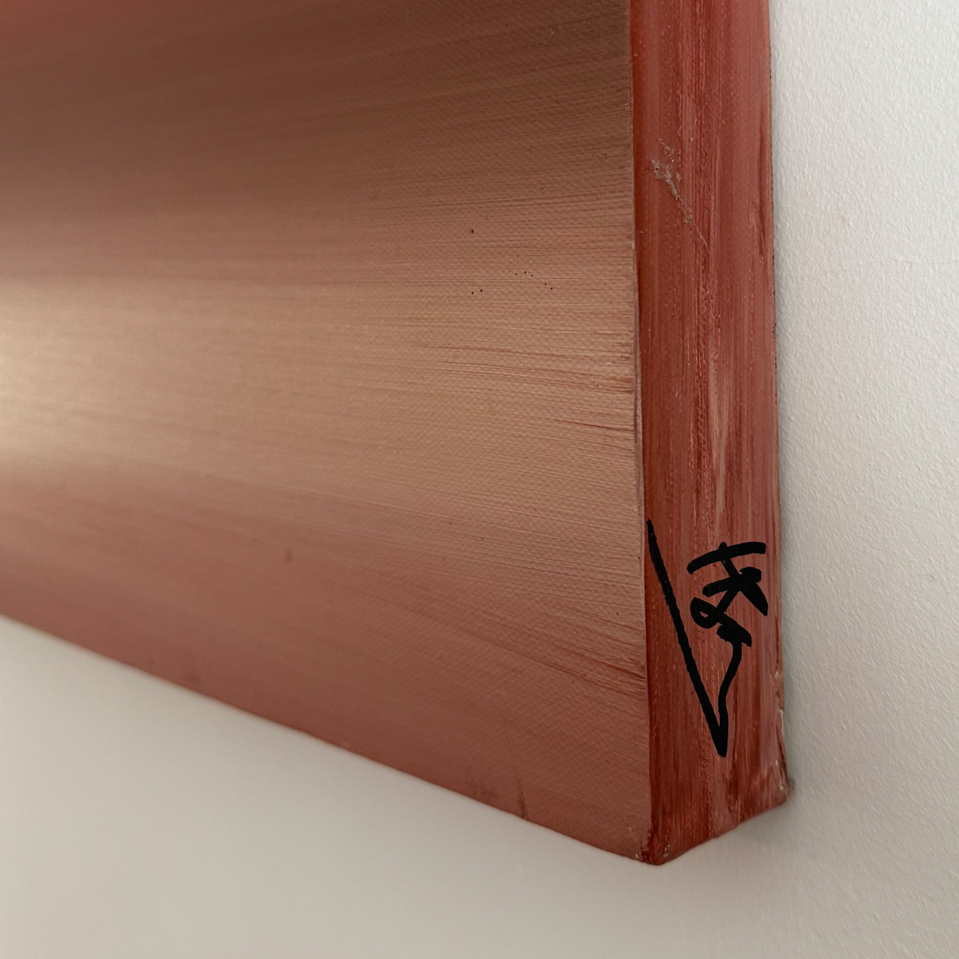 This painting has a calm, flowing quality that draws the eye across the canvas. Soft bands of colour shift from deep earthy reds at the top through warm pinks and gentle creams below, creating a smooth gradient that feels both modern and soothing. The artist used careful blending to achieve this seamless effect, allowing the surface to feel like light passing through a horizon. With its long, narrow shape and understated elegance, this piece works beautifully as a statement artwork while adding a sense of balance and ease to any room.