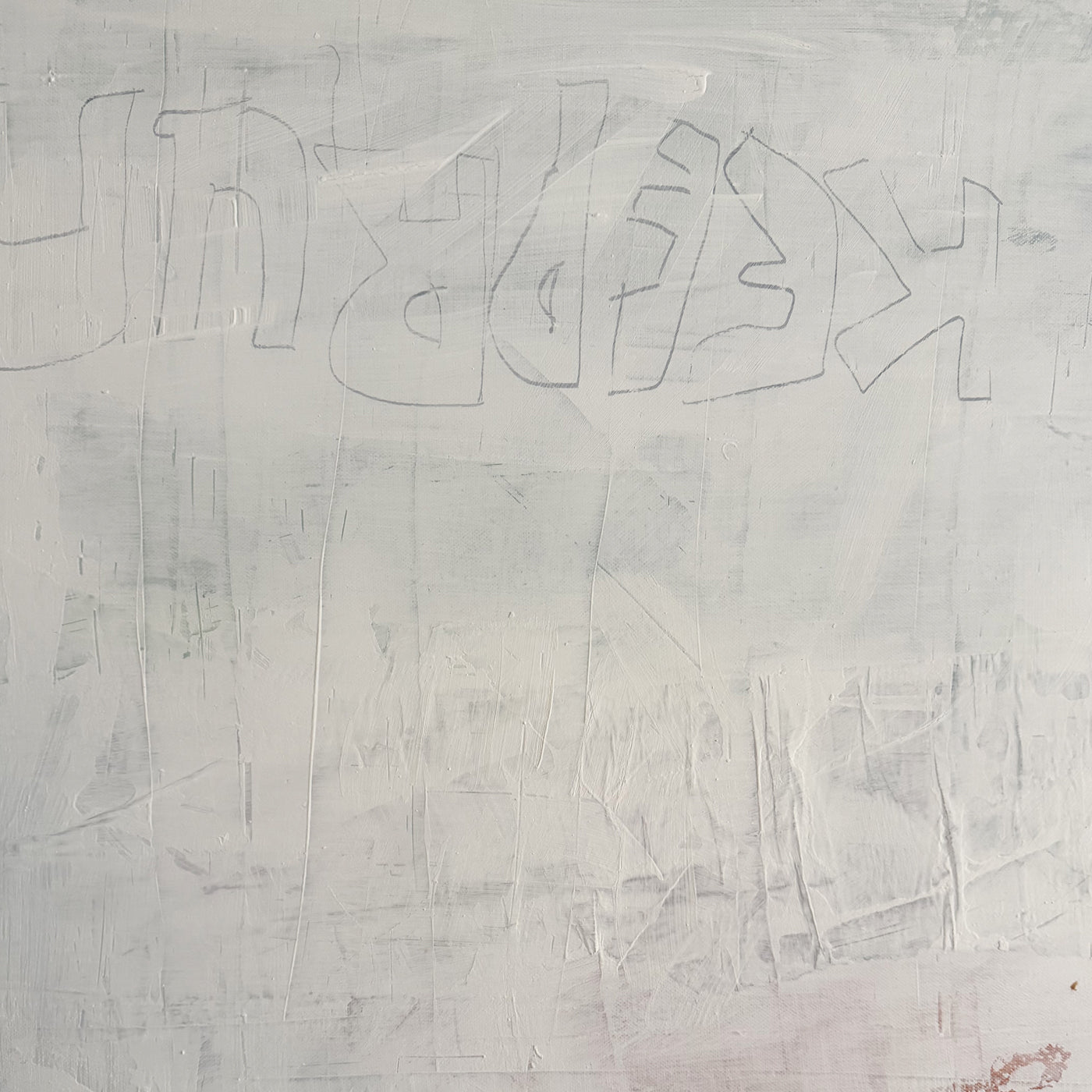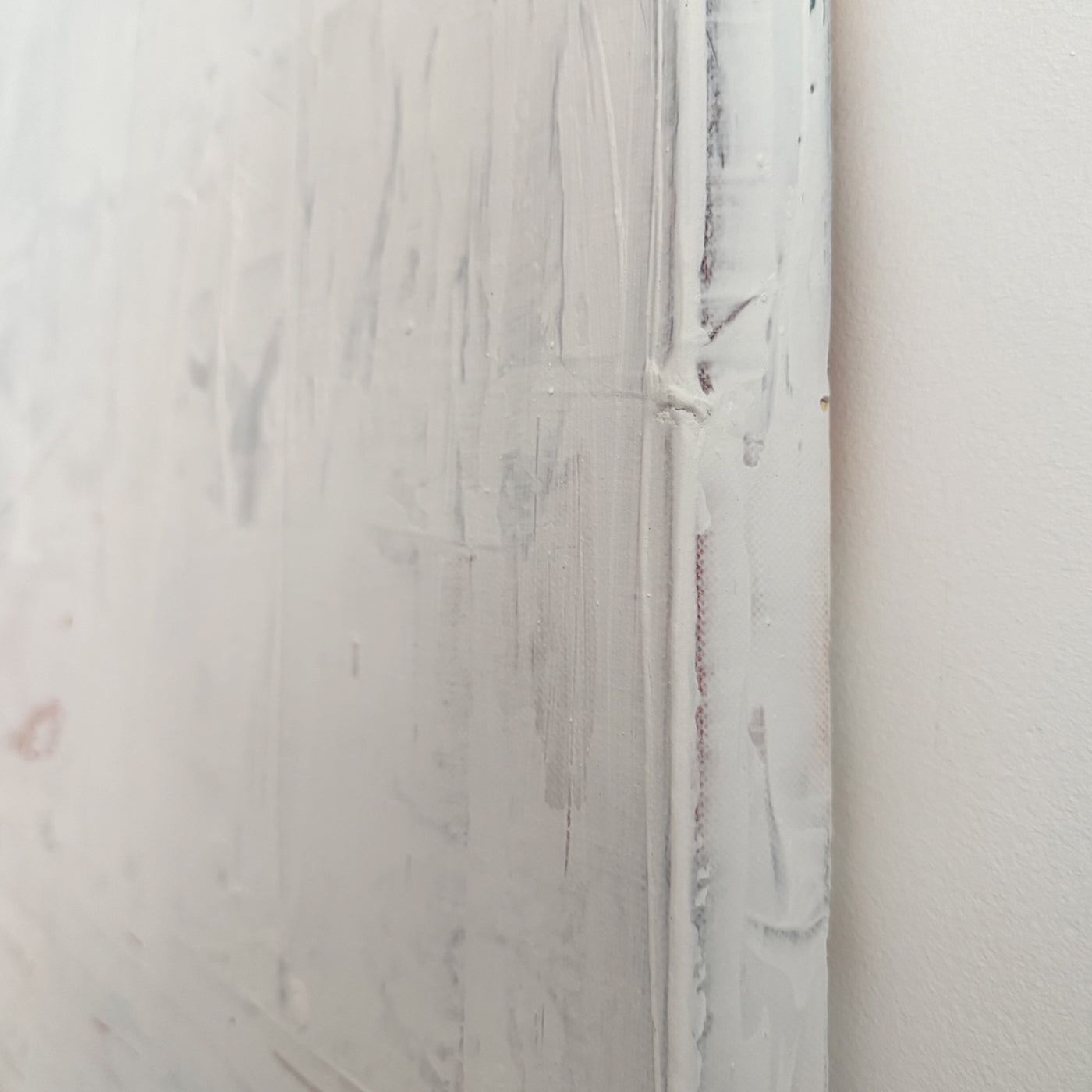 This painting has a calm and minimal style, with soft whites and greys covering most of the canvas. Along the bottom, gentle touches of yellow, green, and blue bring a lift of colour and contrast. Subtle textures run across the surface, adding depth while keeping the overall look clean and simple. The artist used light layers and careful strokes to create a piece that feels open and reflective. It’s an artwork that brings a sense of quiet balance and easy beauty to any room.