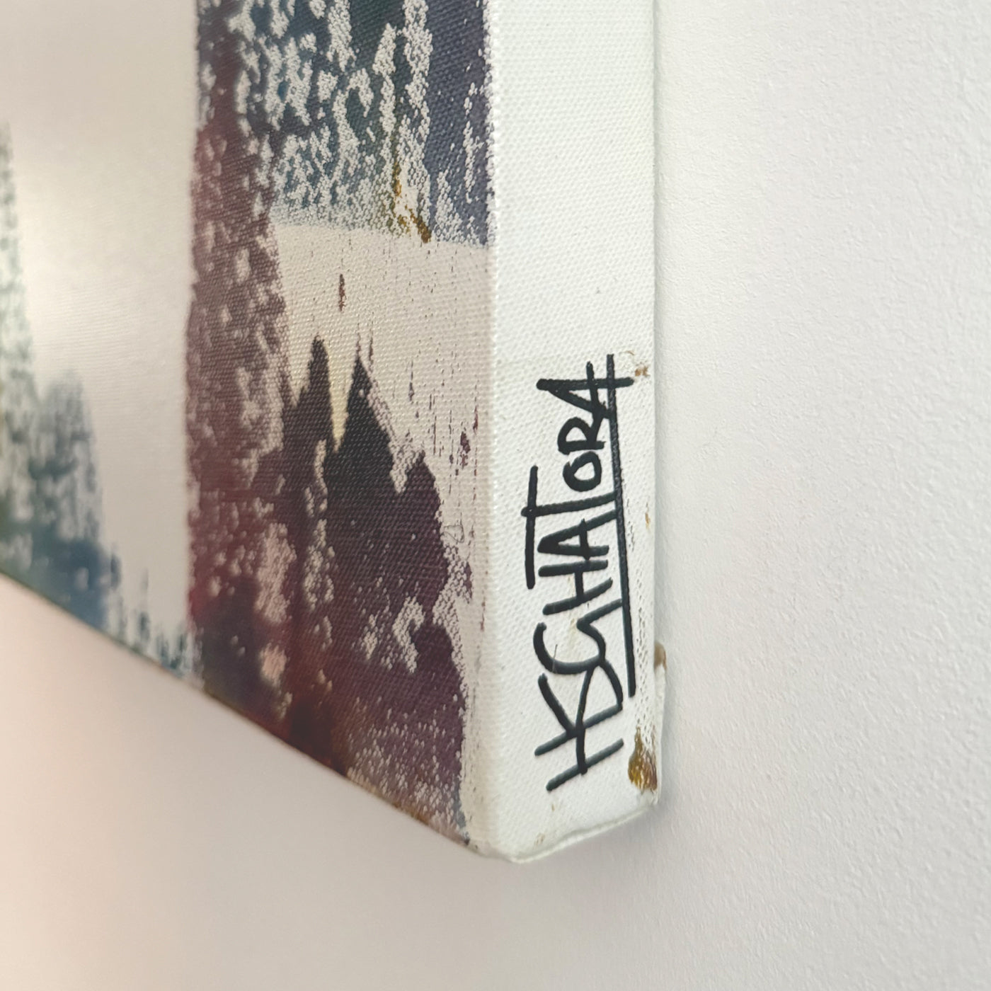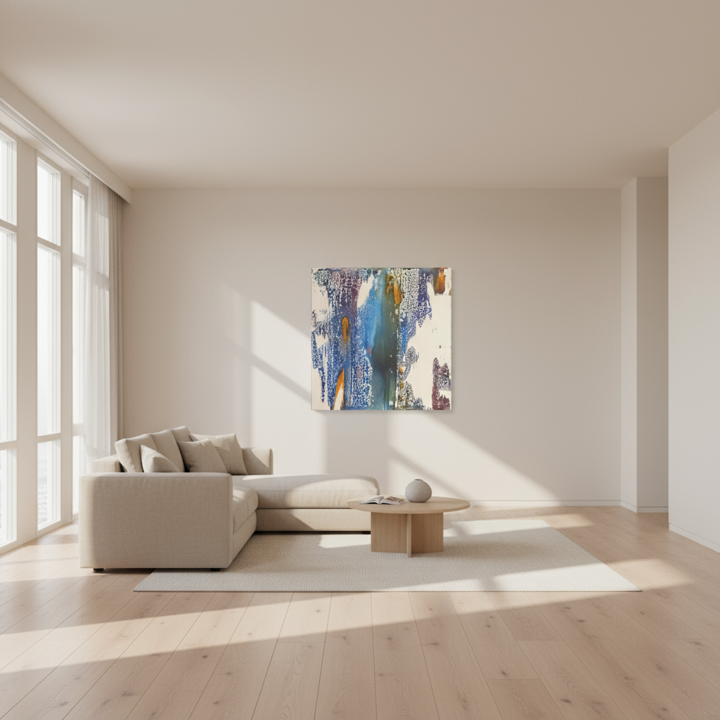 This painting mixes cool tones of blue, purple, and white with flashes of warm gold. The paint runs and breaks across the surface, giving it a weathered, textured feel. The artist worked loosely, letting colour and water find their own paths, creating patterns that feel natural and unforced.